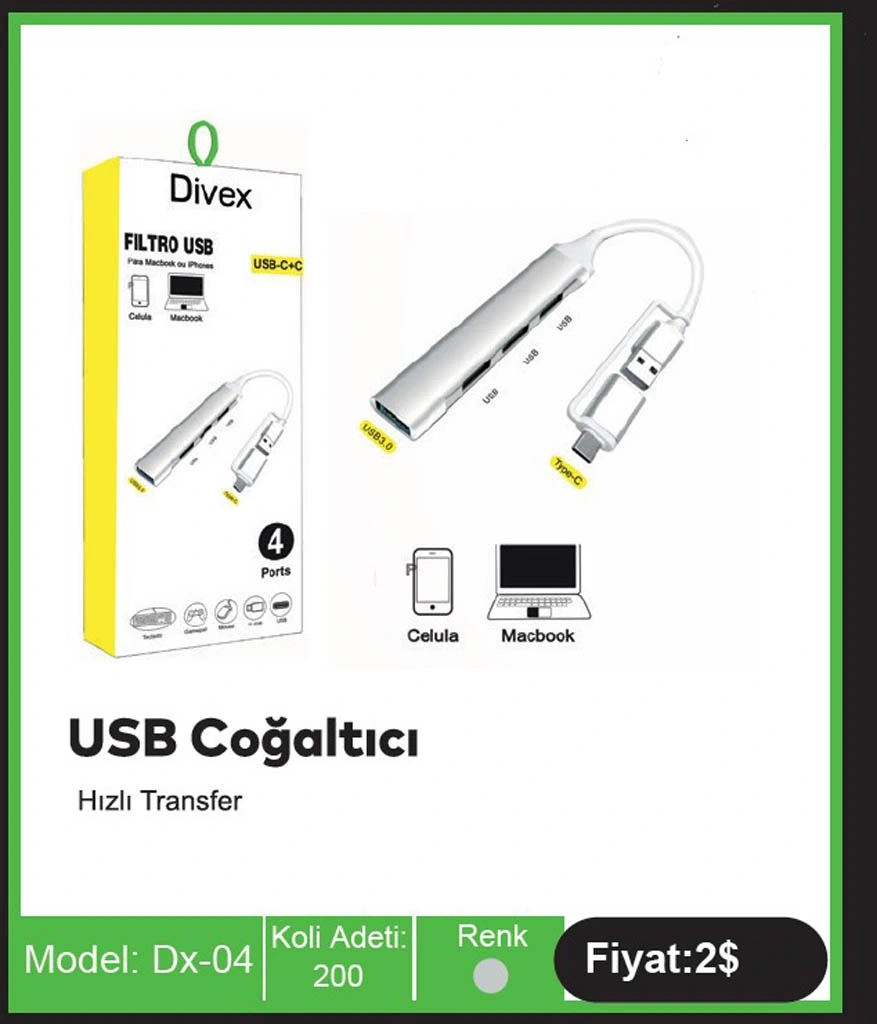 Divex Type-C USB Girişli 4 Port USB Çoklayıcı USB Splitter DX-04, tek bir Type-C portunu dört adet USB portuna dönüştüren kompakt ve kullanışlı bir hub çözümüdür. İnce ve şık tasarımı sayesinde dizüstü bilgisayarlar, tabletler ve akıllı telefonlar için ideal bir aksesuar olarak öne çıkar.