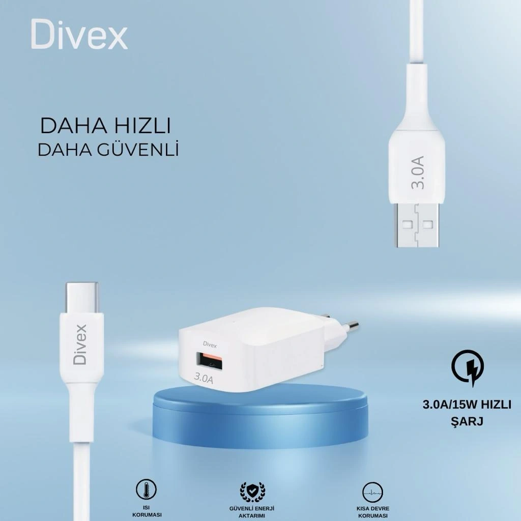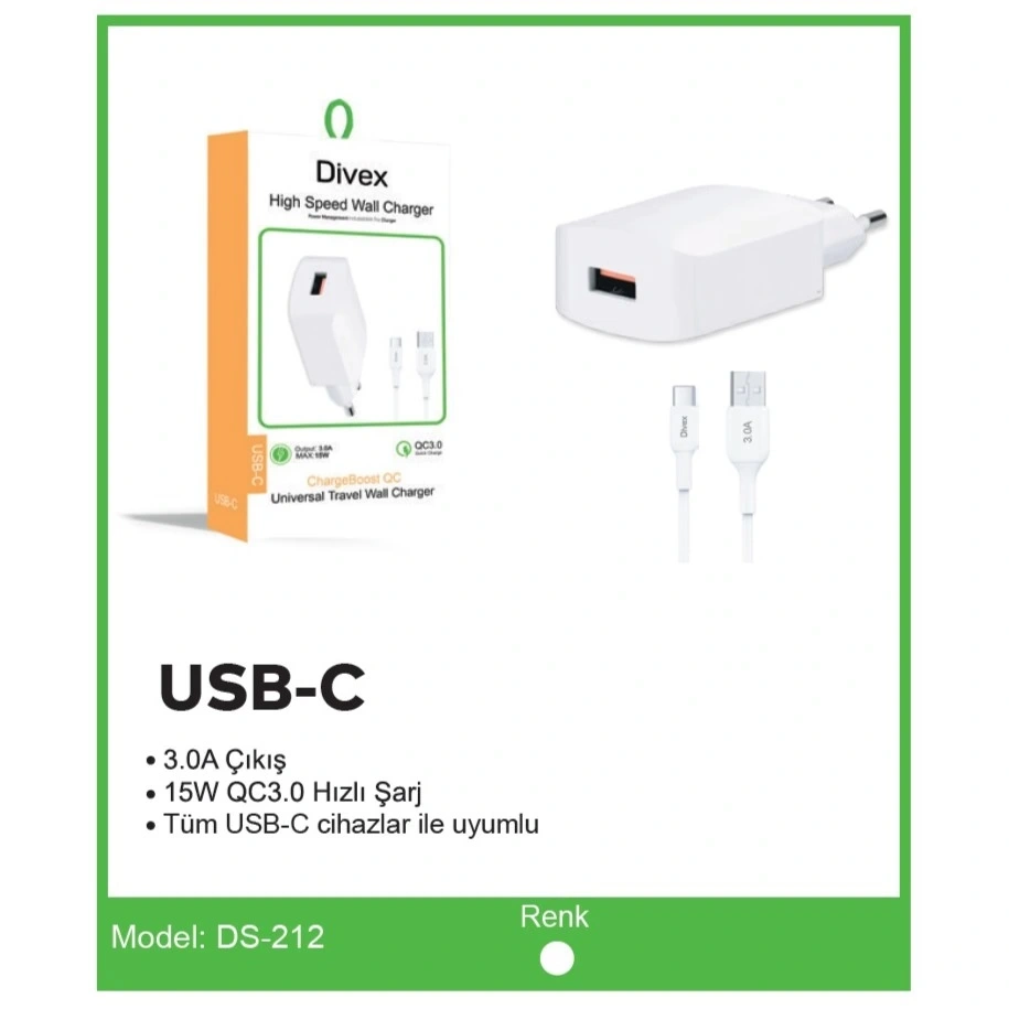 Divex Type-C USB Kablo Adaptör 3.0A Ev Tipi Şarj Aleti DS-212