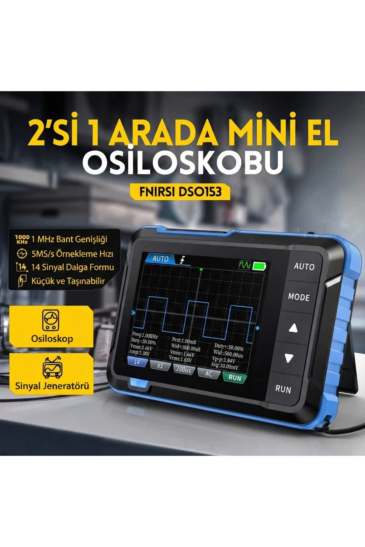 2'si 1 arada mini dijital osiloskop ve sinyal jeneratörü. Osiloskop: 1MHz bant genişliği, 5MS/s örnekleme hızı, tek kanal. Sinyal jeneratörü: sinüs, kare, üçgen, testere dalga formları, 0-50kHz frekans aralığı. 2.4 inç TFT renkli ekran. Otomatik/Normal/Tek tetikleme modları. 1000mAh dahili şarj edilebilir pil. USB-C şarj ve veri aktarımı. Kompakt ve taşınabilir tasarım. Hobi projeleri, eğitim ve basit devre testleri için ideal başlangıç seviyesi 2-in-1 cihaz.