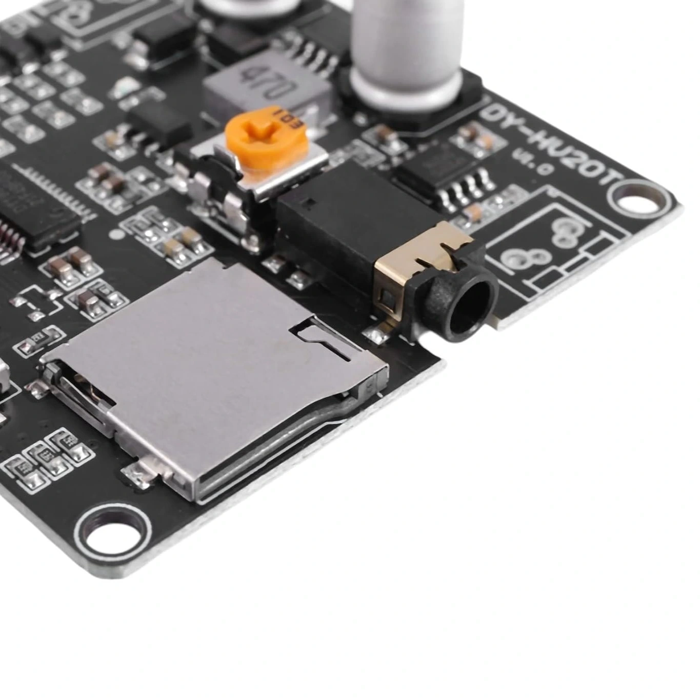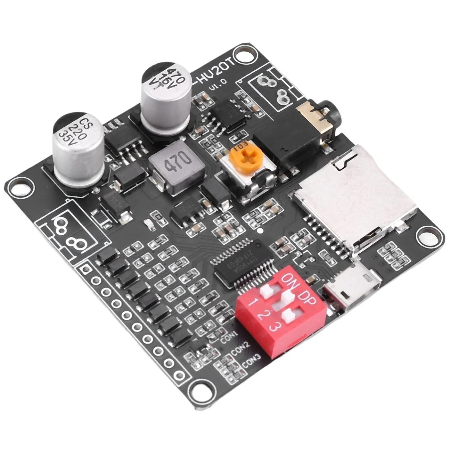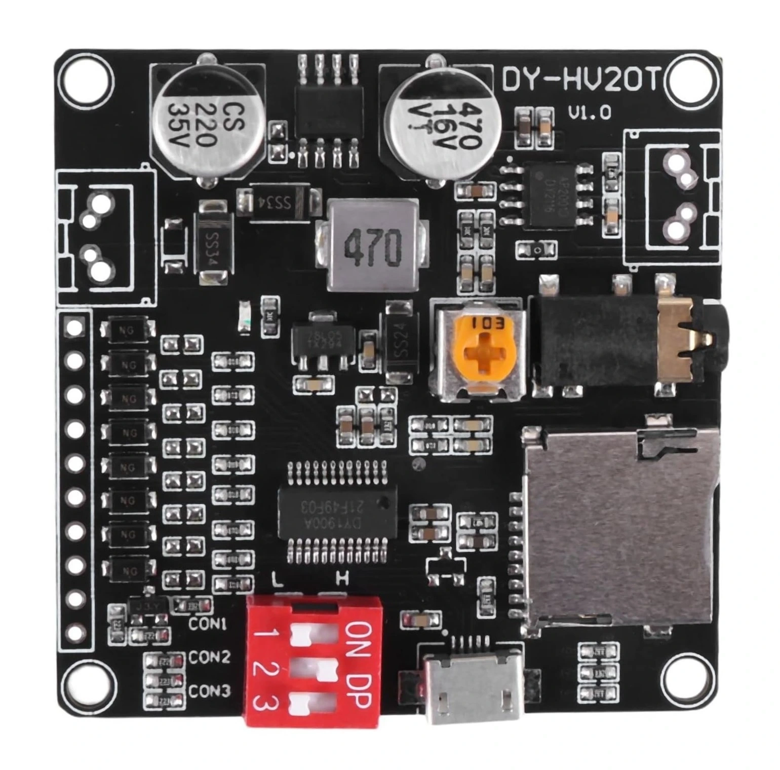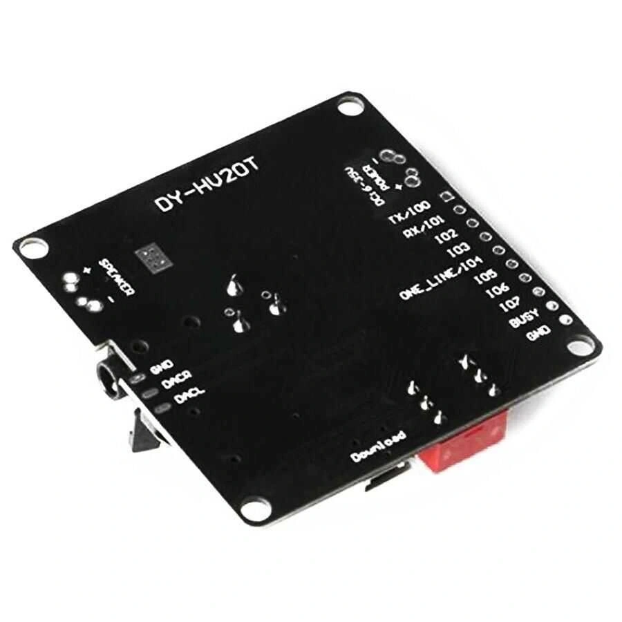DY-HV20T MP3 Ses Çalma Modülü, elektronik ve robotik projelerinize kolayca ses çalma özelliği eklemek için tasarlanmış kompakt ve kullanımı kolay bir ses modülüdür. Micro SD kart üzerinden MP3 formatındaki ses dosyalarını yüksek kalitede çalabilen bu modül, dahili amplifikatör sayesinde harici bir amplifikatöre ihtiyaç duymadan doğrudan hoparlör bağlantısı yapılabilme özelliğine sahiptir.