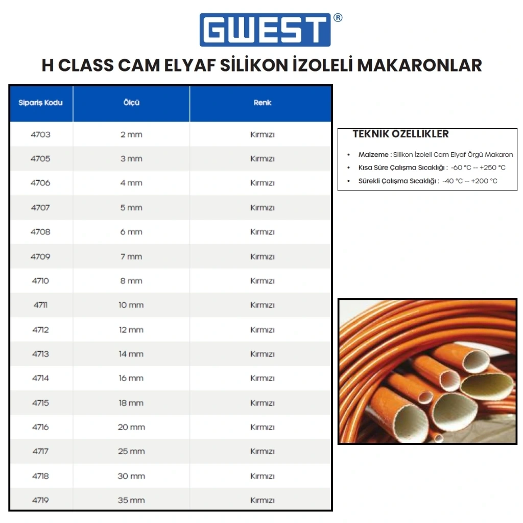 1 Rulo Gwest 8mm H Class Silikon İzoleli Cam Elyaf Makaron 50 Metre