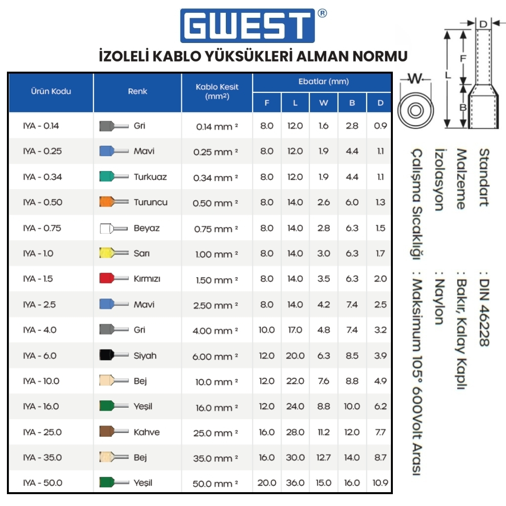 Gwest IYF-0.25 İzoleli Kablo Yüksüğü, 0.25 mm² kesitli çok telli iletkenlerin uçlarını düzenlemek ve güvenli bağlantılar oluşturmak için tasarlanmış bir bağlantı elemanıdır. 1000’li ekonomipaketi ile özellikle pano, otomasyon ve kontrol sistemlerinde seri üretim ve profesyonel kullanıma uygundur.