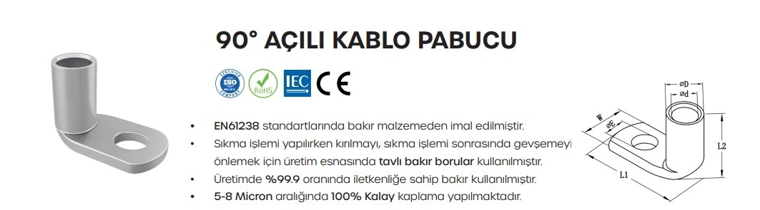 - Ürün Tipi: 90° Açılı Kablo Pabucu