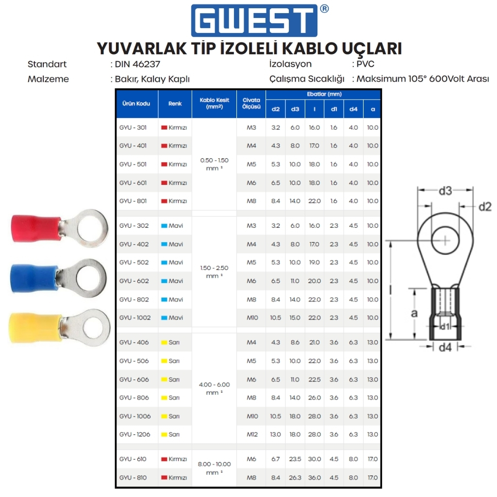 Gwest GYU-502, 1.50 mm² ile 2.50 mm² arası kablo kesitleri için uygun, yuvarlak uç yapısına sahip izoleli bir kablo ucu terminalidir. Elektrik bağlantılarında güvenliği artırmak ve temas noktalarını korumak amacıyla kullanılır. İzoleli yapısı sayesinde kullanıcıya kolay montaj ve güvenli çalışma ortamı sunar.