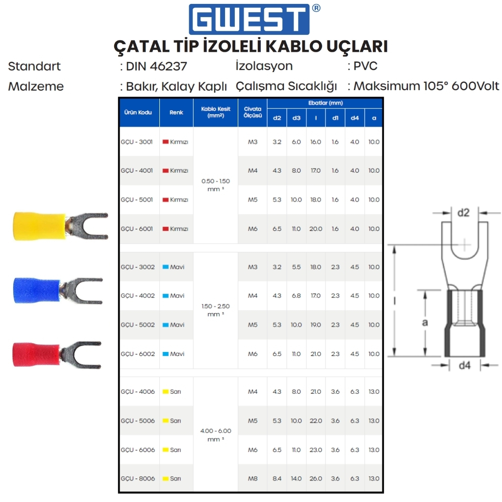 Gwest GÇU-4006 çatal (fork) tip izoleli kablo ucu, 4.00 mm² ile 6.00 mm² arası kablo kesitleriyle uyumlu olarak tasarlanmıştır. Elektrik bağlantılarında güvenlik, sağlamlık ve kolaylık sunar. PVC izole yapısı sayesinde kısa devre risklerini azaltır ve kullanıcıya güvenli çalışma imkânı sağlar. Vidalı bağlantılar için ideal çatal formuyla pratik montaj olanağı sunar.