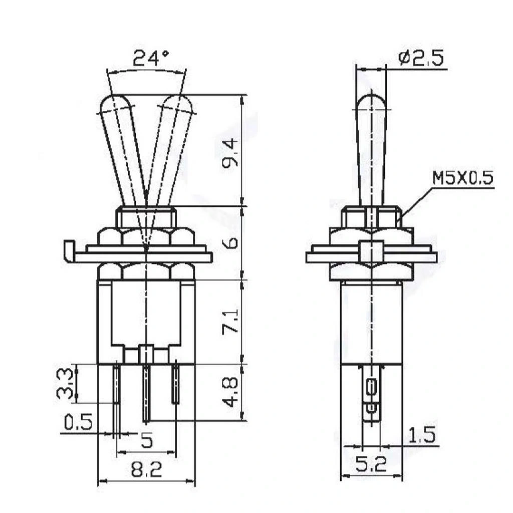 5mm ultra mini toggle switch çok daha küçük montaj deliği gerektirir. Standart modellere göre %70 daha az alan kaplar. Akım kapasitesi daha düşüktür (2A). Kol boyu çok daha kısadır (8mm). Terminal boyutları daha incedir. Özel mikro uygulamalar için tasarlanmıştır. Çok daha hassas montaj ve lehimleme gerektirir.