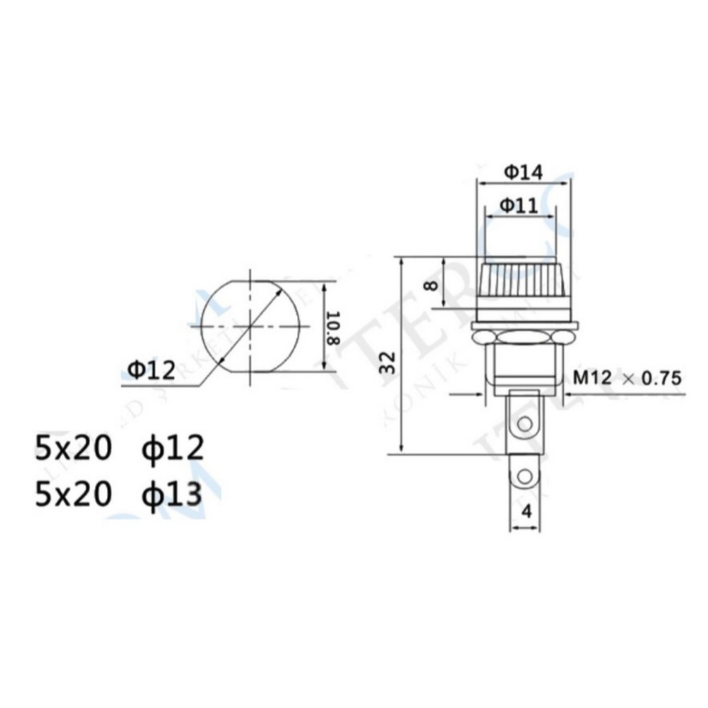 - Boyutlar : 5x20mm sigorta yuvası, Ø12mm - Ø13mm bağlantı çapı