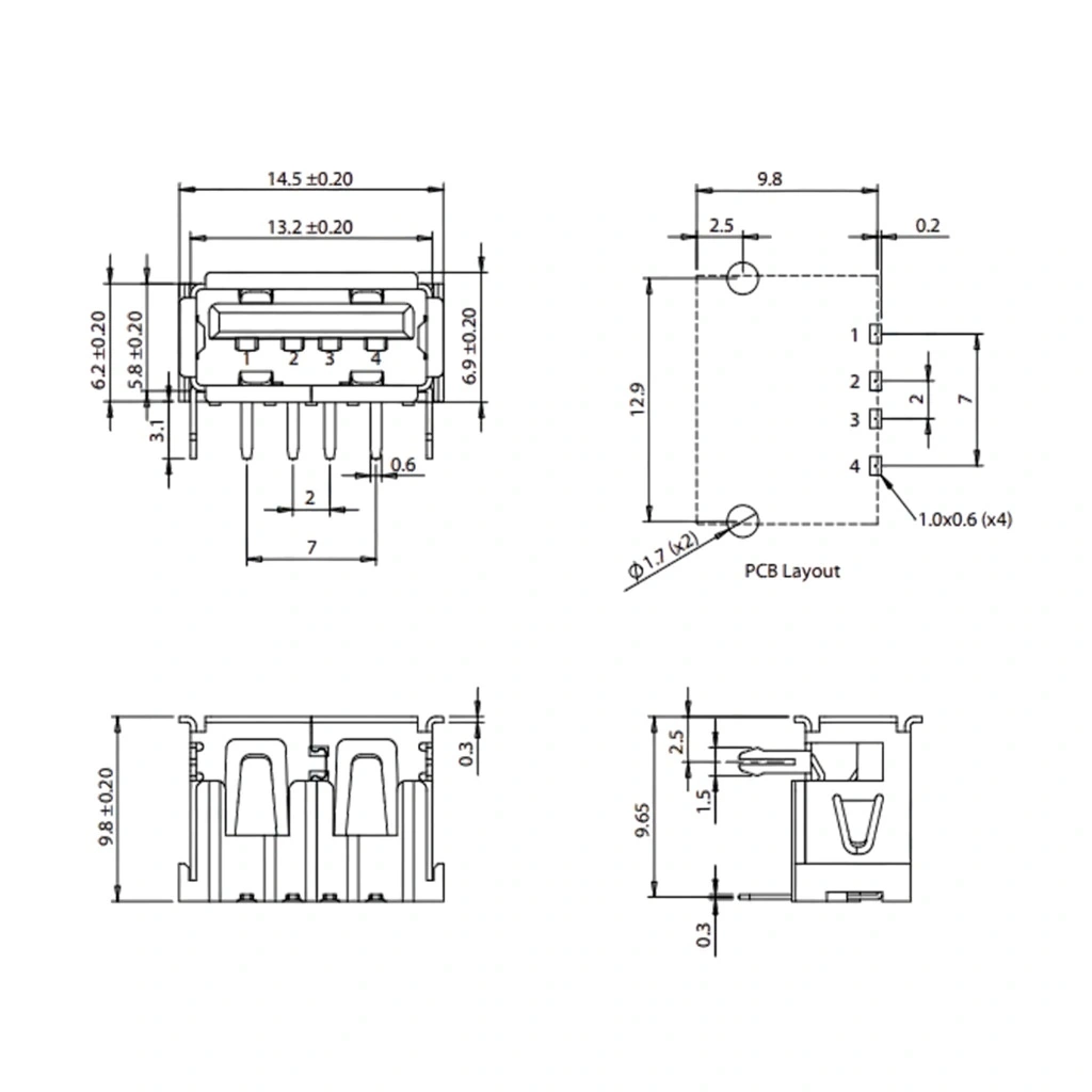 IC-265C USB Şase A Tip 90° Dişi Kısa, USB A Tipi bağlantısının dişi kısmını temsil eden bir bağlantı elemanıdır. Bu bağlantı, cihazlara USB bağlantı kablosu ile veri veya güç iletimi sağlamak amacıyla kullanılır. 90° açıyla tasarlanmış olması, özellikle dar alanlarda bağlantı yapmayı kolaylaştırır ve PCB üzerine yatay montaj imkanı sunar. "Kısa" tasarımı, daha kompakt ve yerden tasarruf sağlayan bir çözüm sunar.