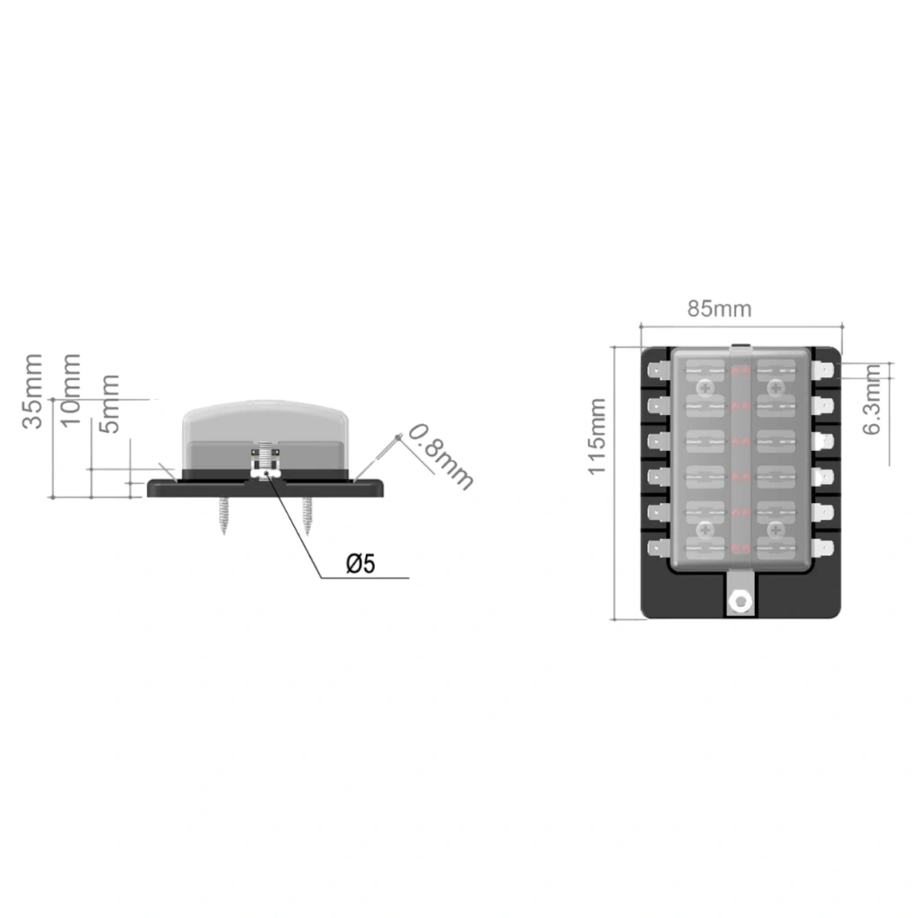 IC-276A-12, 12 ayrı devreyi organize etmek ve korumak amacıyla geliştirilmiş, LED ikaz ışıklı, kompakt yapıya sahip bir sigorta dağıtım kutusudur. Her bir çıkış, kısa devre ya da aşırı akım durumunda karşılık gelen LED ile kullanıcıyı görsel olarak uyarır. Otomotiv, denizcilik, güneş enerjisi sistemleri ve özel devre projeleri için ideal bir çözümdür.