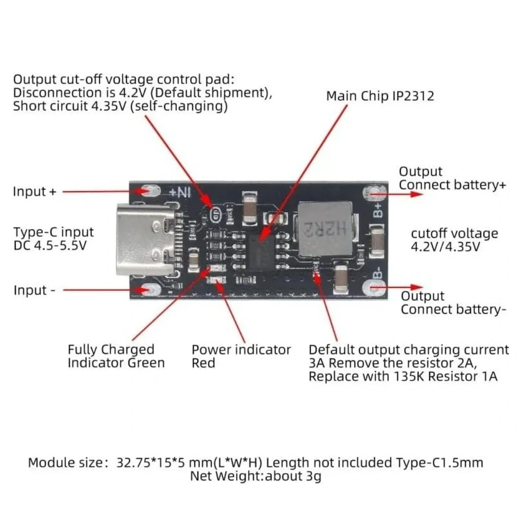 1 Adet IP2312 Type-C 3A Lityum Batarya Hızlı Şarj Modülü