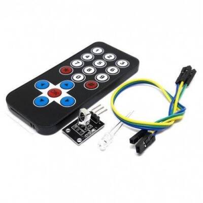 IR Alıcı Verici Kumanda Seti, bir çok fonksiyonu bulunan kullanımı kolay bir üründür. Pek  çok robotik ve hobi projelerinde kullanılabilir. Kullanım için gerekli olan parçalar (Kumandanın pili hariç) ürün içeriğine dahildir. Üzerinde 17 farklı buton bulunmakta ve hepsi çalışmaktadır. Ürün içeriğinde bir adet 38 KHz alıcı göz bulunmaktadır. Bağlantılar için gerekli iki ucu dişi jumper kablolar ürüne dahildir.