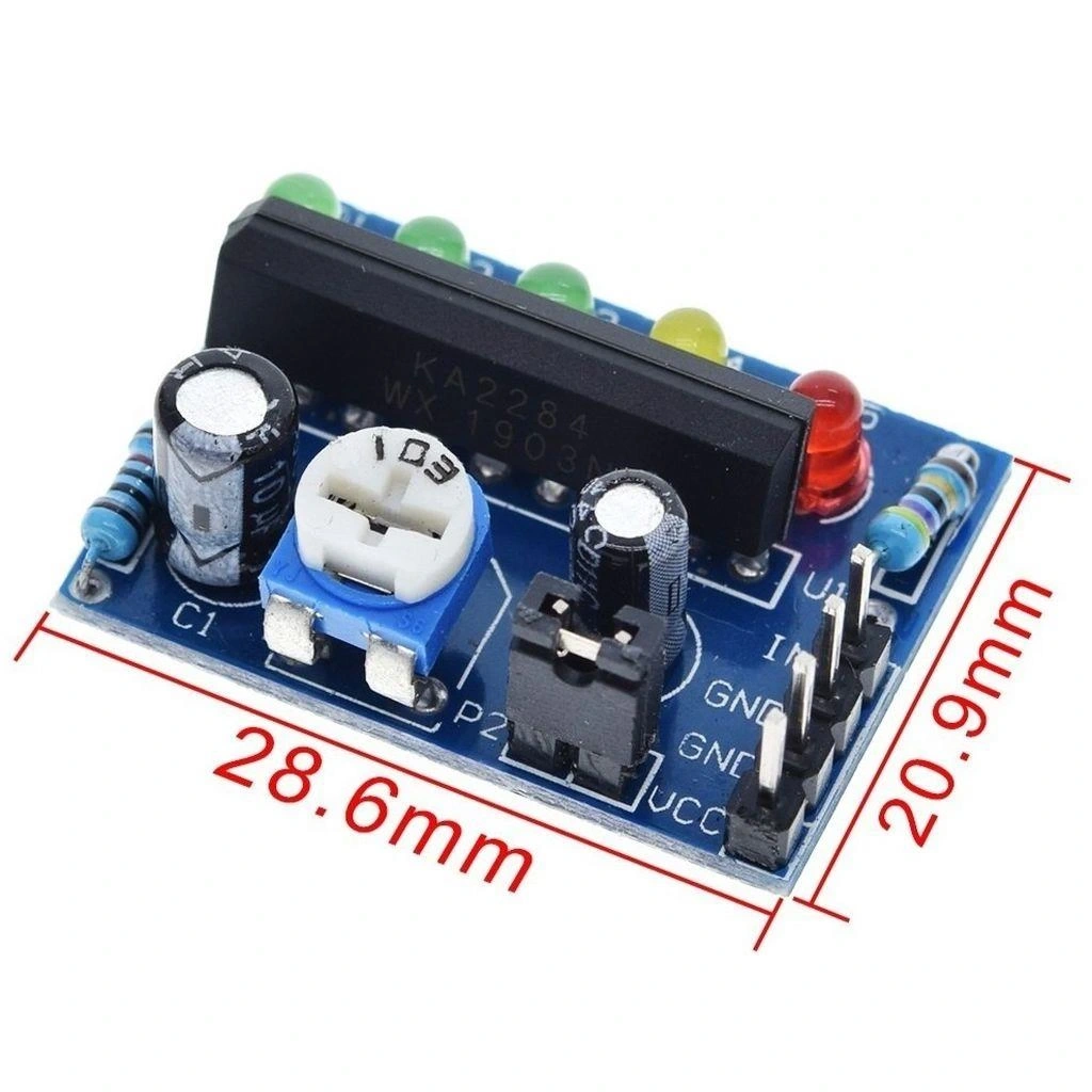 KA2284 Ses Seviyesi Gösterme Modülü Kartı, ses sinyallerinin seviyesini görsel olarak gösteren kompakt bir LED VU metre modülüdür. KA2284 entegresi etrafında tasarlanmış bu modül, 5 adet LED ile ses seviyesini basamaklı olarak gösterir.