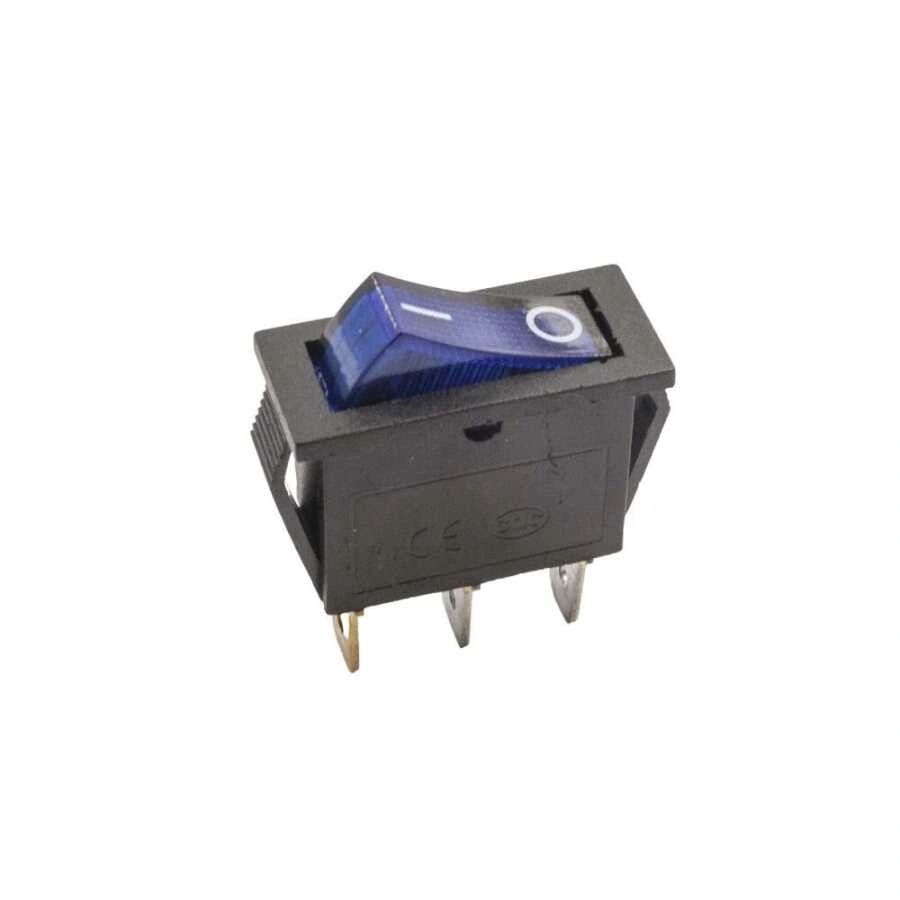 KCD3 Tekli Dar Işıklı On/Off Anahtar - Mavi 3 pinli ışıklı açık rocker anahtar çeşididir. Elektronik cihazlarda, ev aletlerinin kontrolünde yaygın olarak kullanılır. Türü: On-Off Rocker Switch Renk: Siyah Boyutları: 32x14mm Yuva Boyutu: 30x12mm Terminal: 3 pin Pim aralığı: 10mm Akım / Gerilim: 10A / 250V AC.