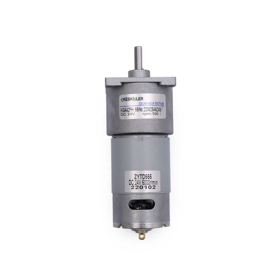 KGA-42 24V 100rpm Redüktörlü Dc Motor 42mm redüktör çapına sahip çeşitli projelerde ve uygulamalarda kullanabileceğiniz redüktörlü dc motor. Motorun tüm ölçülerine ve tork değerlerine aşağıda yer alan tablodan ulaşabilirsiniz. Farklı devirler ve toplu alımlar için bize ulaşabilirsiniz. Özellikler: Besleme Voltajı: 24V DC Yüksüz Akım: 250mA Yükte Akım: 400mA Hız: 100 rpm Tork: 0.4 N.m