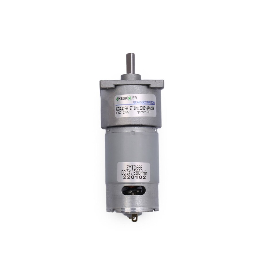 KGA-42 24V 190rpm Redüktörlü Dc Motor 42mm redüktör çapına sahip çeşitli projelerde ve uygulamalarda kullanabileceğiniz redüktörlü dc motor. Motorun tüm ölçülerine ve tork değerlerine aşağıda yer alan tablodan ulaşabilirsiniz. Farklı devirler ve toplu alımlar için bize ulaşabilirsiniz. Özellikler: Besleme Voltajı: 24V DC Yüksüz Akım: 270mA Yükte Akım: 750mA Hız: 190 rpm Tork: 0.3 N.m