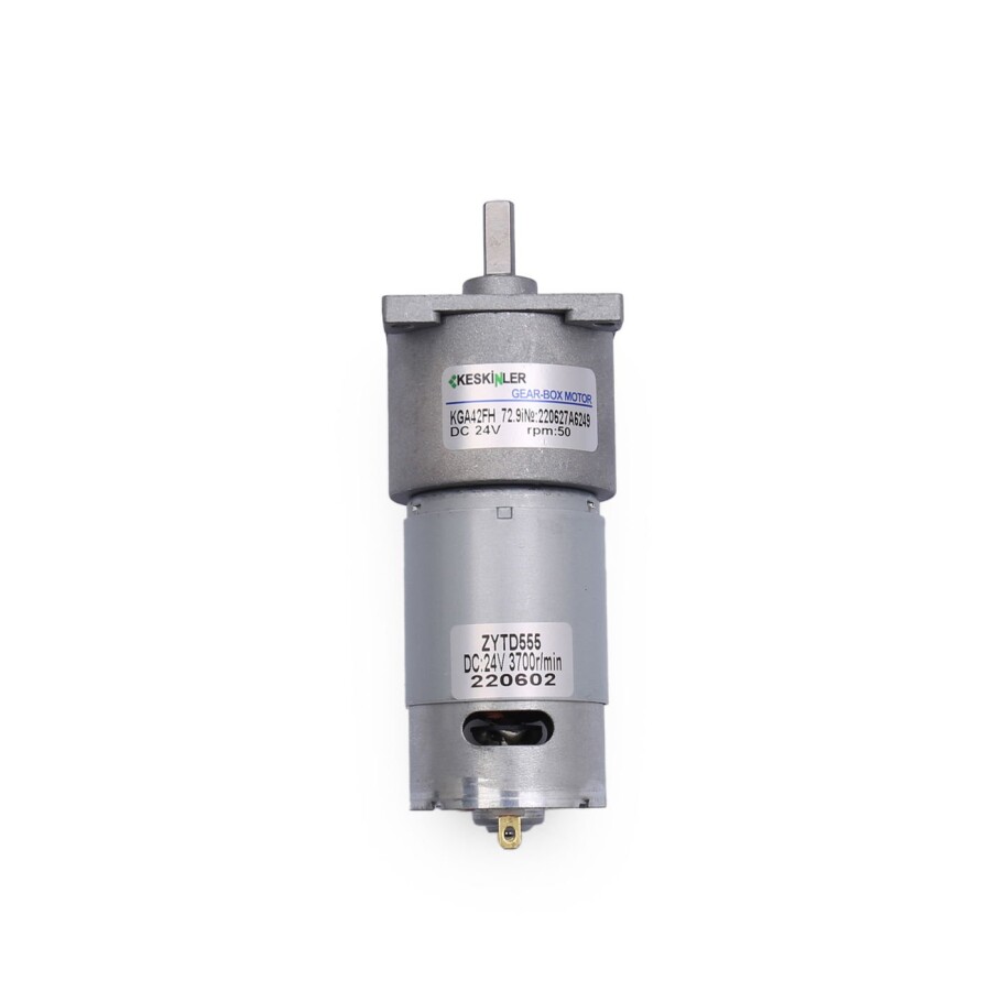 KGA-42 24V 50rpm Redüktörlü Dc Motor 42mm redüktör çapına sahip çeşitli projelerde ve uygulamalarda kullanabileceğiniz redüktörlü dc motor. Motorun tüm ölçülerine ve tork değerlerine aşağıda yer alan tablodan ulaşabilirsiniz. Farklı devirler ve toplu alımlar için bize ulaşabilirsiniz. Özellikler: Besleme Voltajı: 24V DC Yüksüz Akım: 200mA Yükte Akım: 350mA Hız: 60 rpm Tork: 0.5 N.m