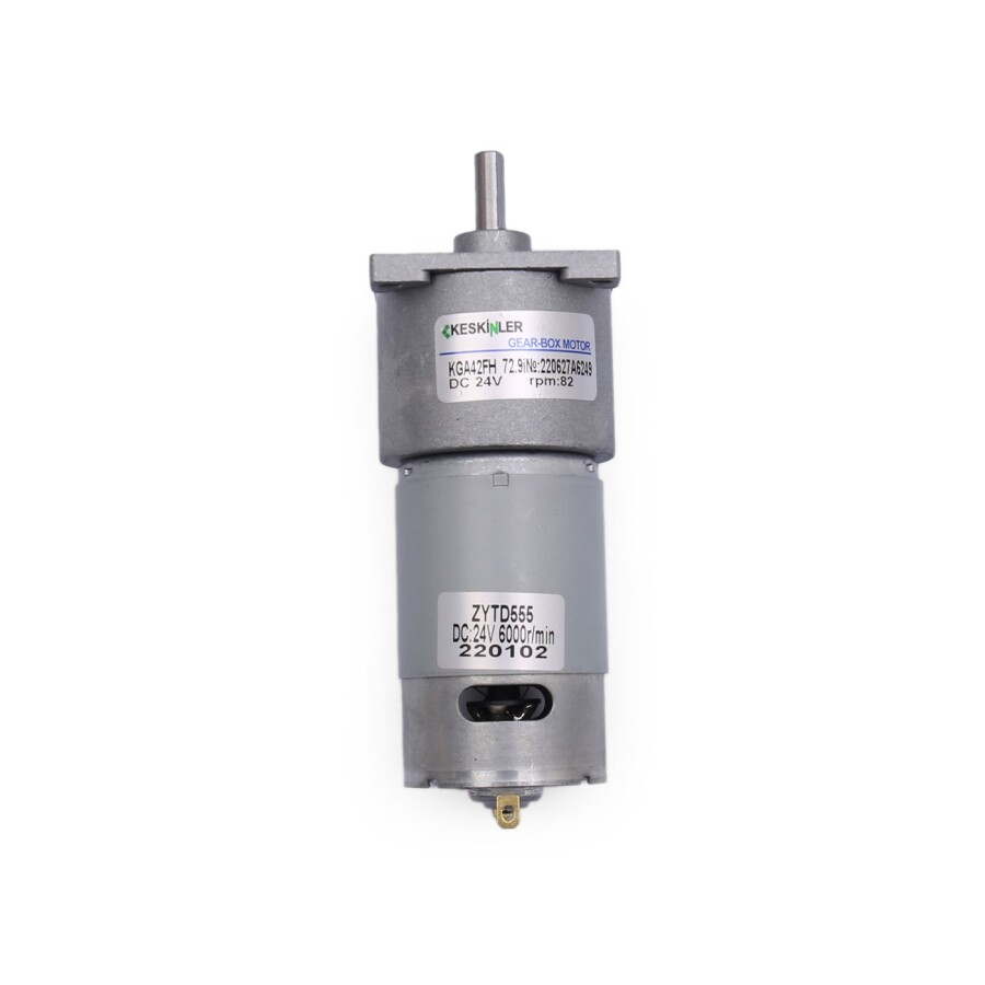 KGA-42 24V 82rpm Redüktörlü Dc Motor 42mm redüktör çapına sahip çeşitli projelerde ve uygulamalarda kullanabileceğiniz redüktörlü dc motor. Motorun tüm ölçülerine ve tork değerlerine aşağıda yer alan tablodan ulaşabilirsiniz. Farklı devirler ve toplu alımlar için bize ulaşabilirsiniz. Özellikler: Besleme Voltajı: 24V DC Yüksüz Akım: 200mA Yükte Akım: 350mA Hız: 82 rpm Tork: 0.45 N.m