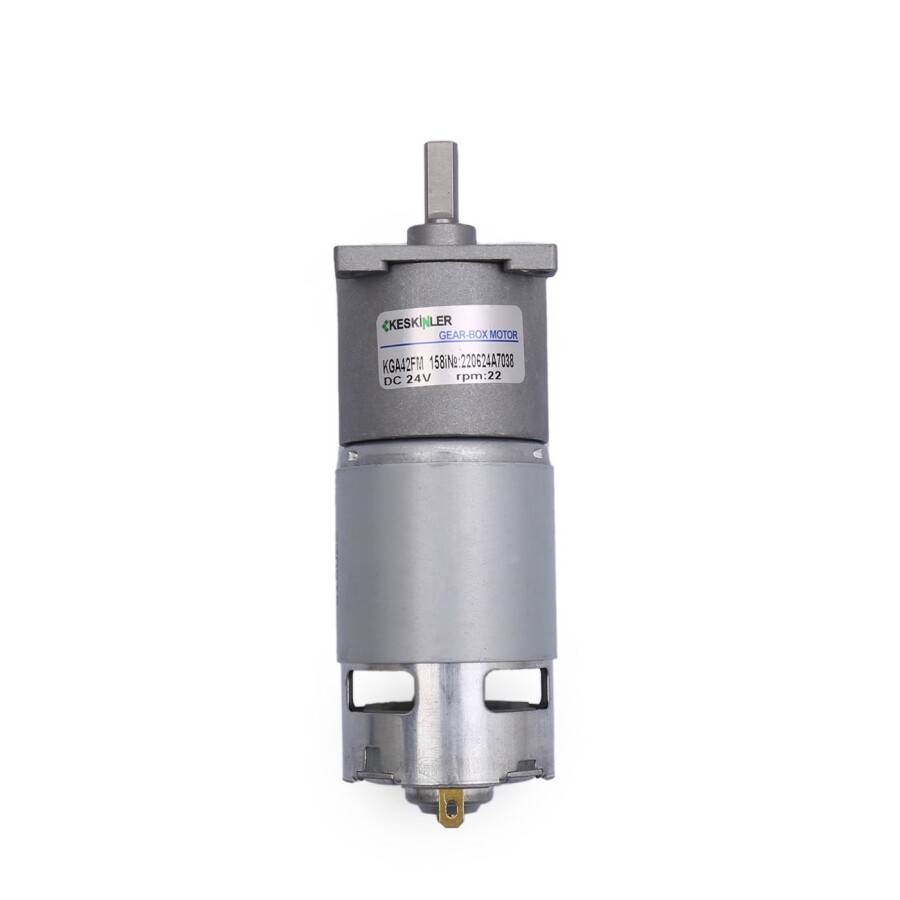 KGA-42FM 24V 22rpm Redüktörlü Dc Motor 42mm redüktör çapına sahip çeşitli projelerde ve uygulamalarda kullanabileceğiniz redüktörlü dc motor. Motorun tüm ölçülerine ve tork değerlerine aşağıda yer alan tablodan ulaşabilirsiniz. Farklı devirler ve toplu alımlar için bize ulaşabilirsiniz. Özellikler: Besleme Voltajı: 24V DC Yüksüz Akım: 350mA Yükte Akım: 800mA Hız: 22 rpm Tork: 1.5 N.m