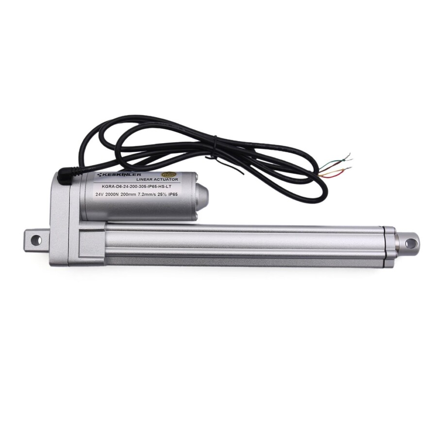 KGRA 24V 200MM 2000N IP65 Hall Sensörlü Lineer Motor KGRA lineer motor, 2000N kapasiteye sahip, saniyede 7.2mm hareket kapasiteli bir lineer motordur. Başlangıç noktasında ve bitiş noktalarında bulunan limit switchler sayesinde bu noktalara geldiğinde yüksek akım çekmez ve motor zorlanmaz. KGRA lineer motorların içerisinde hall sensör bulunmaktadır. Bu sayede hassas konumlandırma gereken yerlerde de kullanıma uygundur. Özellikler: Besleme Voltajı: 24V DC Güç: 2000N Hız: 7.2mm/s Hareket Mesafesi: 200mm Limit Switch: Var Kablo Bağlantıları: Kırmızı: +24V Siyah: GND -24V Sarı: +5V Beyaz: GND Kahverengi: H1 Yeşil: H2