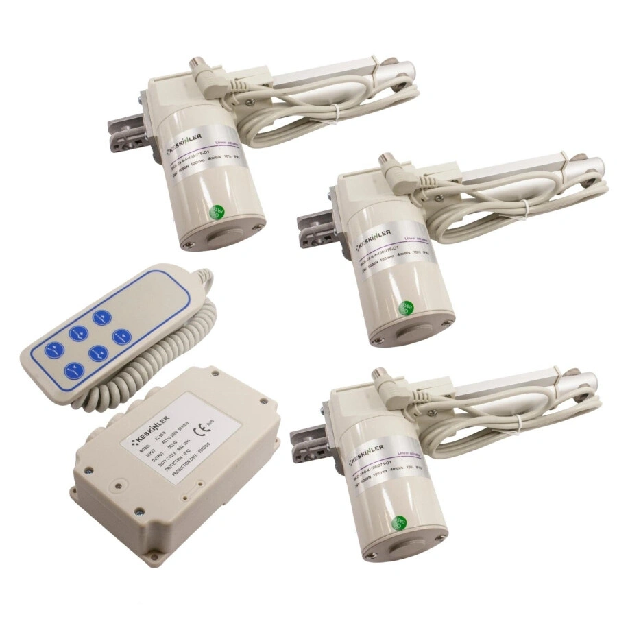 Kumandalı Koltuk / Yatak Motoru Seti - 3 Motorlu Kumandalı Koltuk / Yatak Motoru Seti - 3 Motorlu. 3 adet lineer motor, motorların bağlanacağı bir kontrol ünitesi, ve bu üniteye bağlı bir kumandadan oluşan set. Bu ürünü hareketli yatak ve koltuklarda kullanabilirsiniz. Özellikle hasta yataklarında bu motorlar tercih edilmektedir. Ürün içerisindeki 3 motoru farklı düzlemlere takarak 3 eksende hareket kabiliyeti yakalamak mümkündür. Motor Özellikleri: Besleme Voltajı: 24V DC Güç: 6000N Hareket Kapasitesi: 100mm Hız: 4mm/s Koruma: IP43 Motorlar kontrol paneline takılmaktadır ve kontrol paneli doğrudan prize takılıp 220V ile beslenmektedir. Bu nedenle motorlar için ekstra bir 24V güç kaynağına ihtiyaç yoktur..