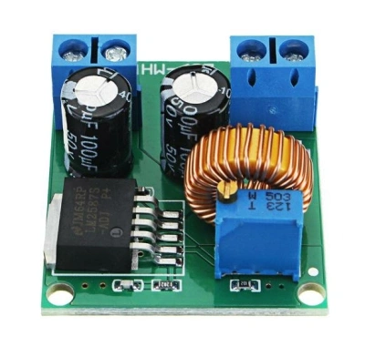 LM2587 DC-DC 3.5 - 30V Voltaj Yükseltici Modül LM2587 voltaj regülatörünün giriş gerilimi 3.5V-30V ve çıkış gelirimi 4.0V-30V olmalıdır. Maksimum giriş akımı 5A'dir. Modülün verimliliği % 92'dir. Test ettiğinizde, çıkış voltajı giriş voltajından daha yüksek değilse, potansiyometreyi saat yönünde çevirin, çıkış voltajı yükselecektir. Saat yönünün tersine çevirirseniz, giriş volajıjnın yüksek olmasından dolayı modül hasar görür. Teknik Özellikler Giriş voltaj aralığı: 3.5V-30V (Çıkış voltajının, giriş voltajından daha yüksek olmasını sağlayınız) Çıkış voltaj aralığı: 4.0V-30V Giriş maksimum akım : 5A Sürekli Akım: 3A.