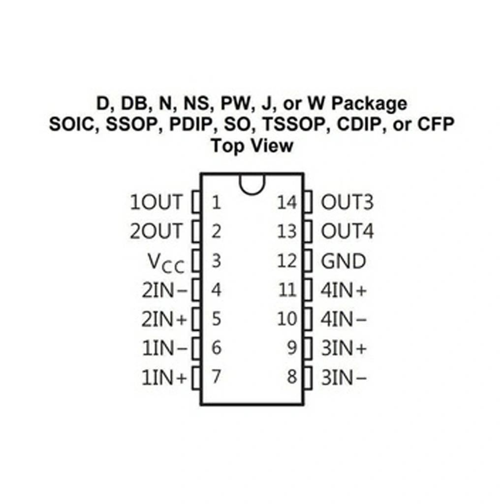 - Pin Yapısı: 1,7,8,14 (Çıkışlar), 2,6,9,13 (Tersleyen Girişler), 3,5,10,12 (Terslenmeyen Girişler), 4 (Vcc), 11 (GND)