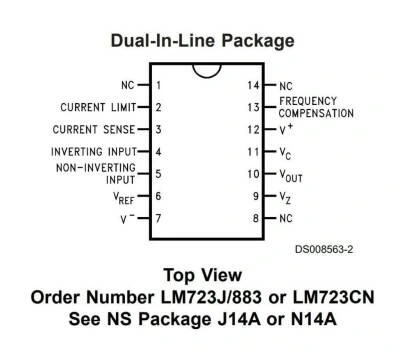 LM723 / LM723C, öncelikle seri regülatör uygulamaları için tasarlanmış bir Voltaj regülatörüdür. Kendi başına, 150 mA'ya kadar çıkış akımları sağlayacaktır; ancak istenen herhangi bir yük akımı sağlamak için harici transistörler eklenebilir. Devre, son derece düşük bekleme akımı drenajına sahiptir.