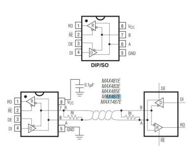 MAX483, RS-485 ve RS422 iletişimi için düşük güçlü alıcı-vericilerdir. Bir sürücü ve bir alıcı içerir. MAX483, EMI\\\'yi en aza indiren ve yanlış sonlandırılan kabloların neden olduğu yansımaları azaltan, böylece 250 kbps\\\'ye kadar hatasız veri iletimine izin veren azaltılmış dönüş hızı sürücülerine sahiptir.