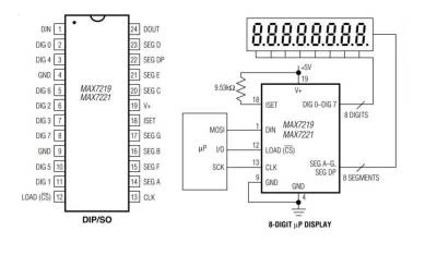 MAX7219 / MAX7221, mikroişlemcileri (µP) 8 basamağa kadar 7 segmentli sayısal LED ekranlara, çubuk grafik ekranlara veya 64 ayrı LED'e bağlayan kompakt, seri giriş / çıkış ortak katot ekran sürücüleridir. Çip üzerinde bir BCD kod-B kod çözücü, çoklu tarama devresi, segment ve basamak sürücüleri ve her basamağı depolayan 8x8 statik RAM bulunur. Tüm LED'ler için segment akımını ayarlamak için yalnızca bir harici direnç gereklidir.