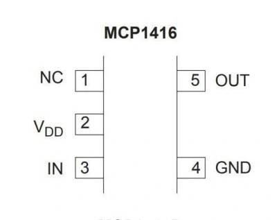 MCP1416T-E/OT, 1.5A tepe çıkış akımı sağlayabilen, az yer kaplayan, düşük taraflı bir MOSFET sürücüsüdür. Bu, giriş sinyali yüksek olduğunda çıkış sinyalinin de yüksek olduğu anlamına gelen, ters çevirmeyen düşük taraf sürücüsüdür. Cihazın adı MOSFET sürücüsü olsa da, bu cihazların MOSFET'in kapısını sürmenin yanı sıra başka uygulamaları da var. Bu cihaz aynı zamanda küçük bir DC motorunu yönlendirmek için kullanılır, yüksek hızlı veri hatları için tampon görevi görür ve düşük Voltajdan yüksek Voltaja arayüz sağlamak için seviye çeviricileri görevi görür.