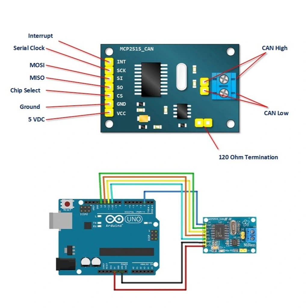 MCP2515 CAN-BUS SPI Ağ Haberleşme Modülünün bağlantı şeması ve kullanım talimatları.