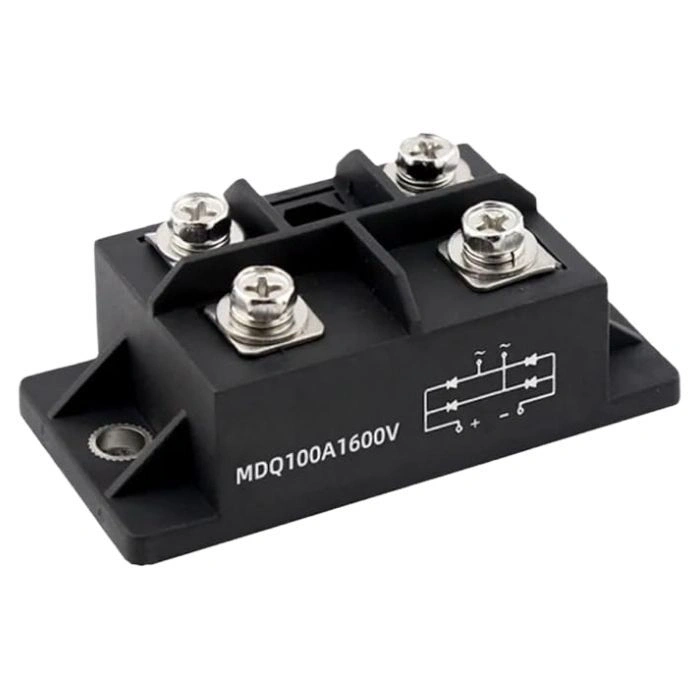 MDQ100-16 100A 1600V Tek Faz Köprü Diyot - Şase Tip MDQ100-16 100A 1600V Tek Faz Köprü Diyot - Şase Tip, 100A'ya kadar yük ve 1600V'a kadar olan DC ve AC devrelerinde kullanılır. Diyot köprüleri, cihazın mevcut ekipmana kolayca entegre edilmesini sağlayan standart bir endüstriyel kasada yer alır. Devrenin "~" girişine alternatif bir akım verilir. Tek Fazlı Köprü Diyotlar genellikle güç ekipmanlarında, güç kaynakları için doğrultucu; değişken frekanslı sürücüler için giriş doğrultucu; akü şarj doğrultucu olarak kullanılmaktadır. Datasheet.