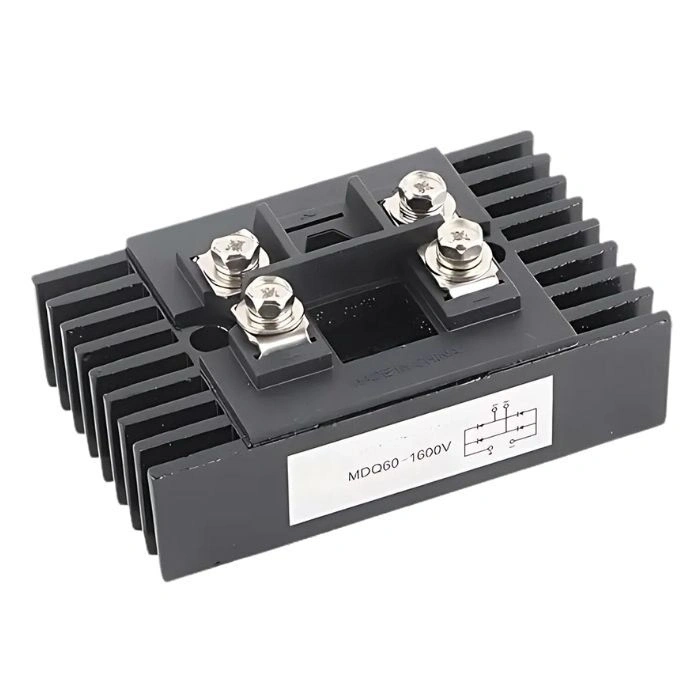 MDQ60-16 60A 1600V Tek Faz Köprü Diyot - Soğutuculu MDQ60-16 60A 1600V Tek Faz Köprü Diyot - Soğutuculu, 60A'ya kadar yük ve 1600V'a kadar olan DC ve AC devrelerinde kullanılır. Diyot köprüleri, cihazın mevcut ekipmana kolayca entegre edilmesini sağlayan standart bir endüstriyel kasada yer alır. Devrenin "~" girişine alternatif bir akım verilir. 98x60x27mm boyutlarındadır. Tek Fazlı Köprü Diyotlar genellikle güç ekipmanlarında, güç kaynakları için doğrultucu; değişken frekanslı sürücüler için giriş doğrultucu; akü şarj doğrultucu olarak kullanılmaktadır..
