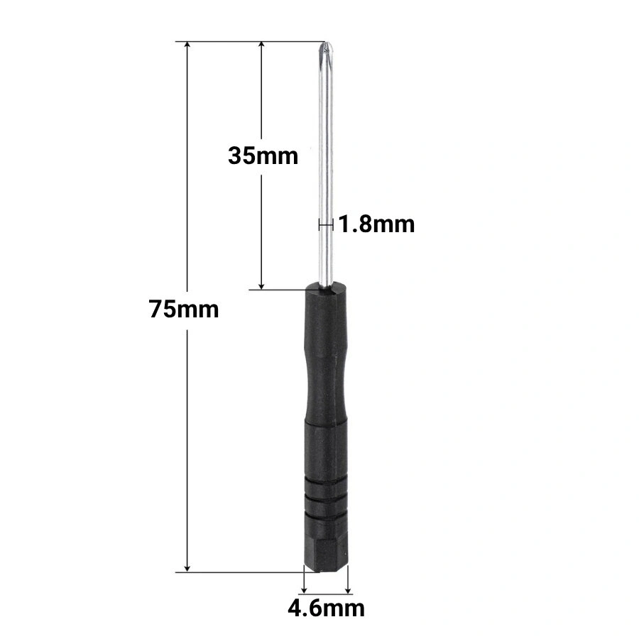 Mini Yıldız Tornavida Küçük Vidalar İçin M2-M3 boyutlarında vidalarla kullanıma uygun, genellikle elektronikte, telefon veya saat tamirinde kullanılan tornavida. 73mm boyutundaki bu mini tornavida küçük vidalarla birlikte kullanıma uygundur. Boyutlar: Toplam Uzunluk: 73mm Çap: 1.60~1.95mm.