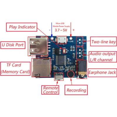 Kendi MP3 çalarınızı yapabileceğiniz, Micro SD Kart ve USB Flash bellek destekli amfi devresi. MP3 + WAV + WMA formatlarını destekler.