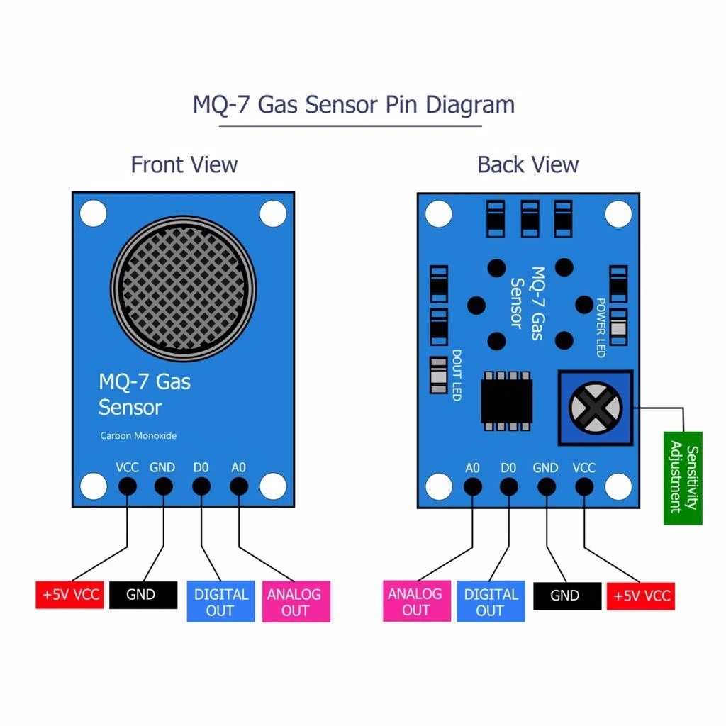 MQ-7 Karbonmonoksit Gazı Algılayıcı Sensör Modülünün bağlantı şeması ve kullanım talimatları.