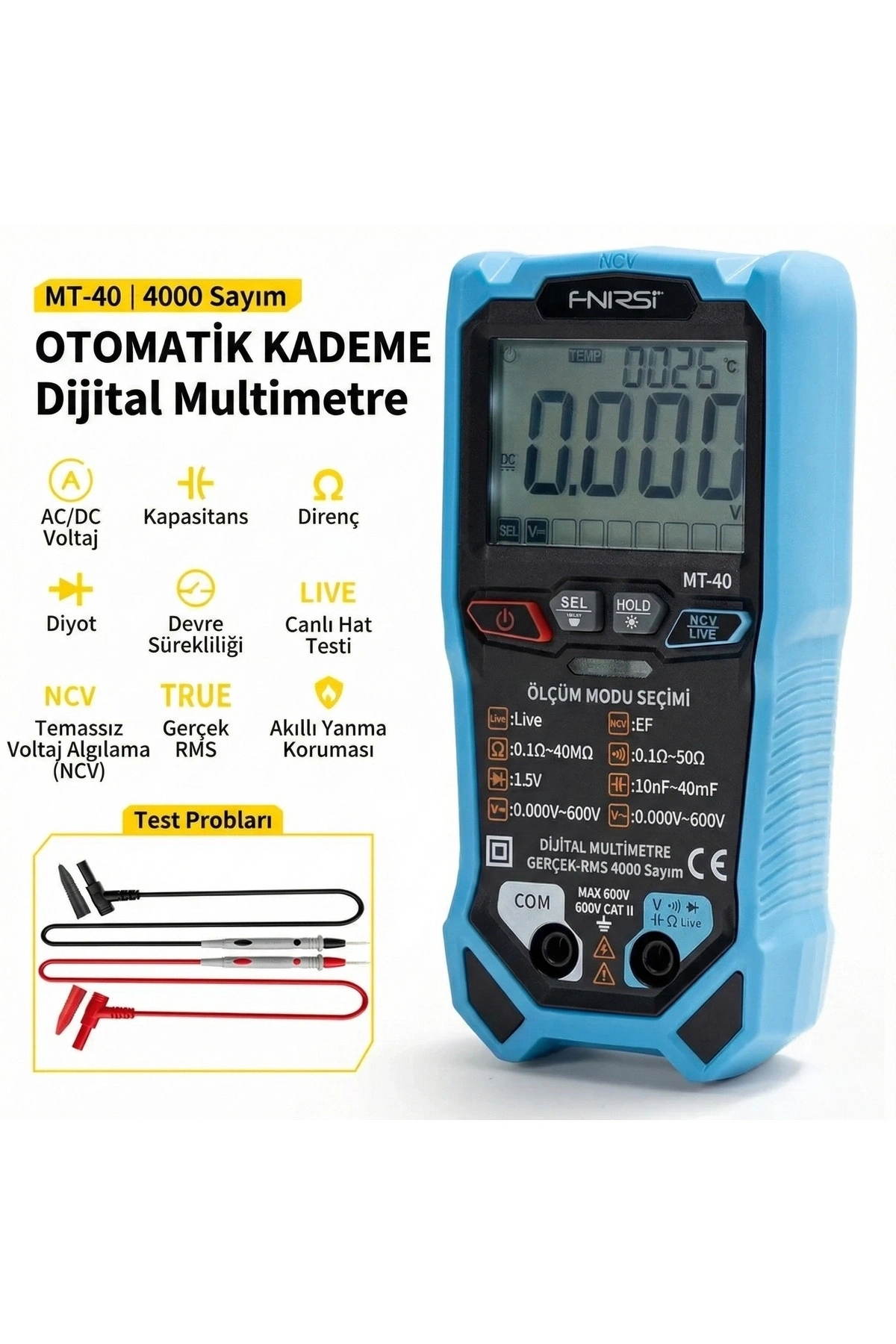 Gelişmiş bir çip ile güçlendirilen MT-40, saniyede 3 kez ultra hızlı örnekleme hızına sahiptir ve hassas analizler için gerçek zamanlı veriler sunar. Bu güçlü cihaz; True RMS ölçümü, kapasitans, direnç, diyot testi ve temassız voltaj algılama (NCV) gibi çeşitli fonksiyonları destekler.