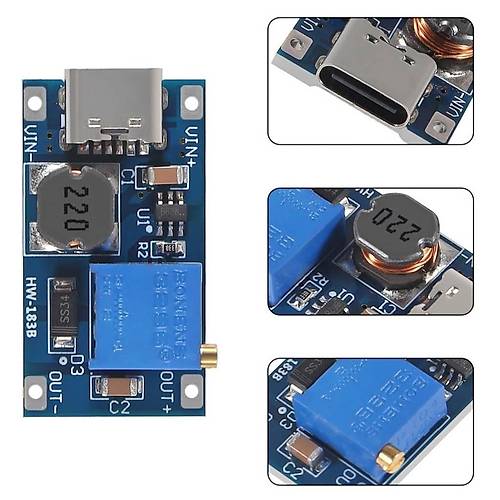 Modül üzerindeki mavi potansiyometreyi hassas bir tornavida ile döndürerek çıkış voltajını ayarlayabilirsiniz. Saat yönünde çevirmek voltajı artırır, saat yönünün tersine çevirmek azaltır. Ayarlama yaparken bir multimetre ile Type-C çıkışındaki voltajı ölçün. Voltaj ayarını yüksüz durumda yapın, yani Type-C portuna cihaz bağlamadan önce ayarlayın. Aşırı voltaj riskini önlemek için ayarlamaya düşük voltajdan başlayıp kademeli olarak artırın.