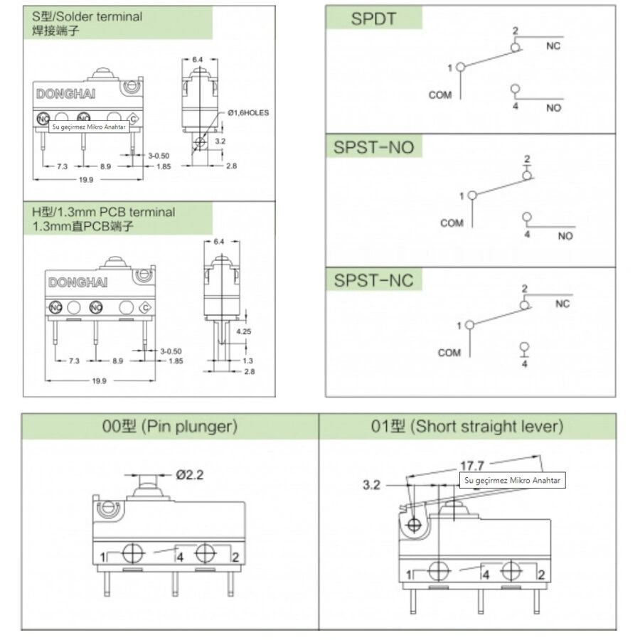 MT8-S00D300A06 SPDT NO+NC 3-Pin Toz Geçirmez Micro Switch MT8-S00D300A06 SPDT NO+NC 3-Pin Toz Geçirmez Micro Switch, endüstriyel ve ev tipi kontrol sistemlerinde kullanılan dayanıklı ve güvenilir bir temel mikro anahtardır. Küçük yapısına rağmen yüksek akım kapasitesi, hassas tetikleme ve esnek montaj imkânı sunar. Elektrikli cihazlar, otomasyon sistemleri, kapı sensörleri, ekipman tetikleme noktaları ve çok daha fazlası için ideal çözümdür. Özellikler Nominal Akım & Gerilimi: 3A 125/250VAC / 3A 36VDC 300gf max SPDT NO+NC Terminal Tipi: Solder Terminal