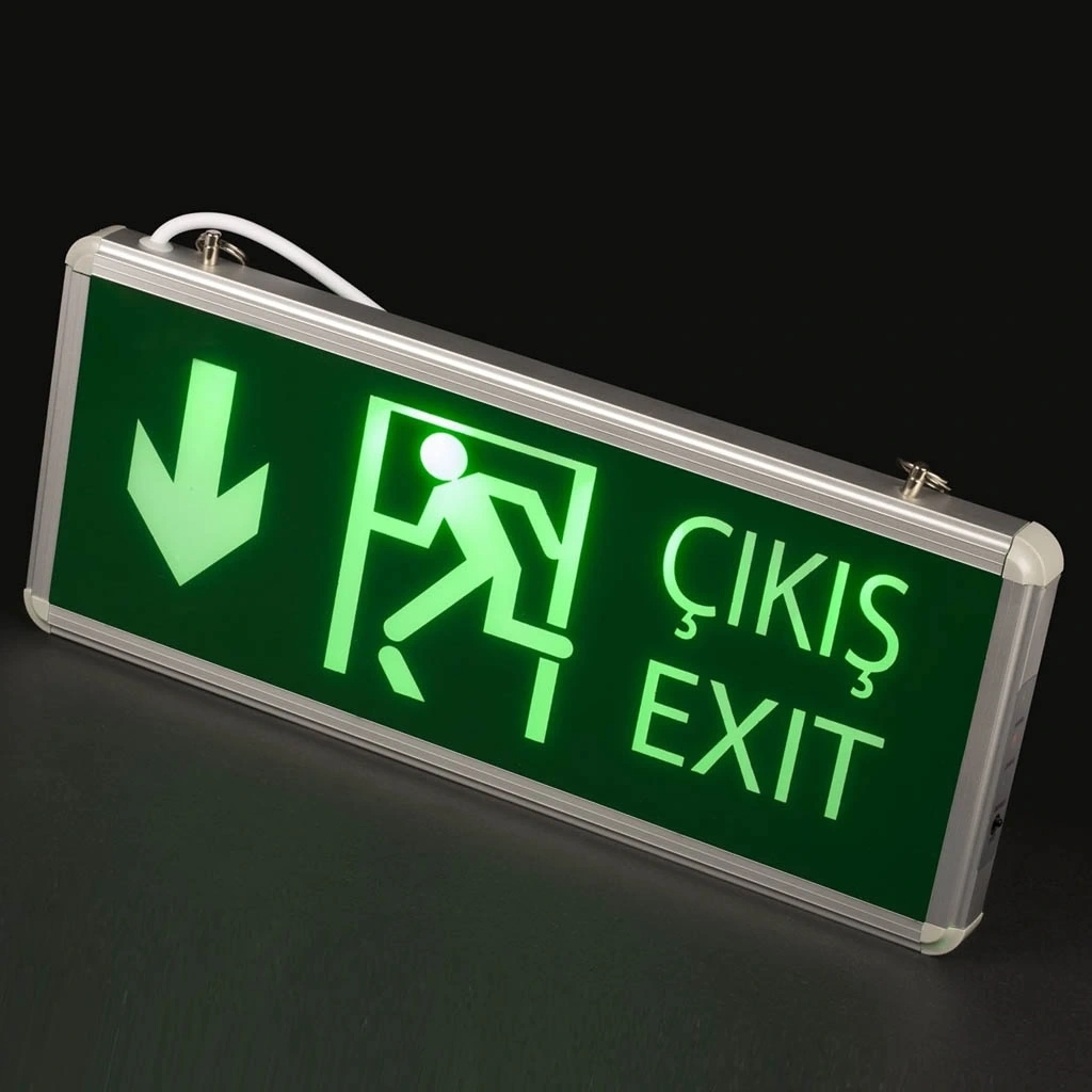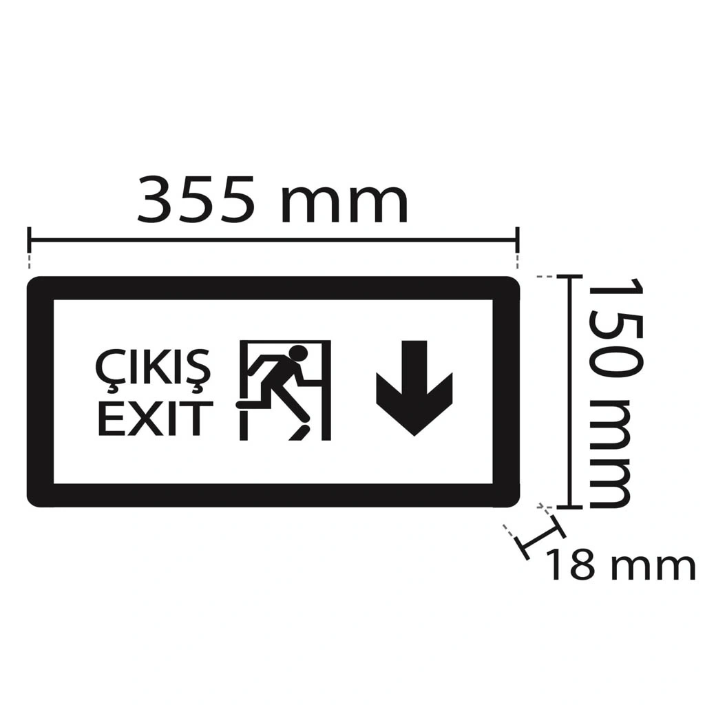 Çift yönlü tasarımı ile koridorun her iki yönünden de görülebilen bu acil çıkış armatürü. exit yazısı ve aşağı ok işareti ile insanları en yakın çıkışa doğru yönlendirir.