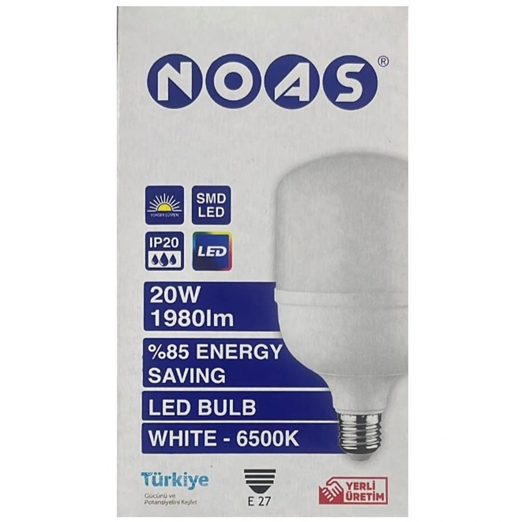 NOAS YL95-2001 LED Torch Ampul, 20W gücü ve 6500K beyaz ışık rengiyle geniş alanları aydınlatmak için tasarlanmış yüksek verimli bir aydınlatma çözümüdür. Torch özelliği ile uzun ve odaklanmış ışık ışını sağlar.