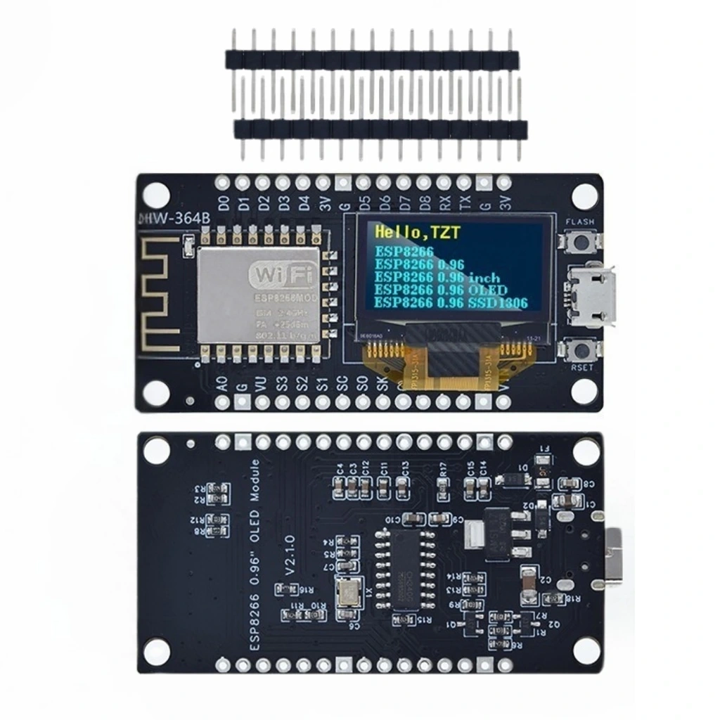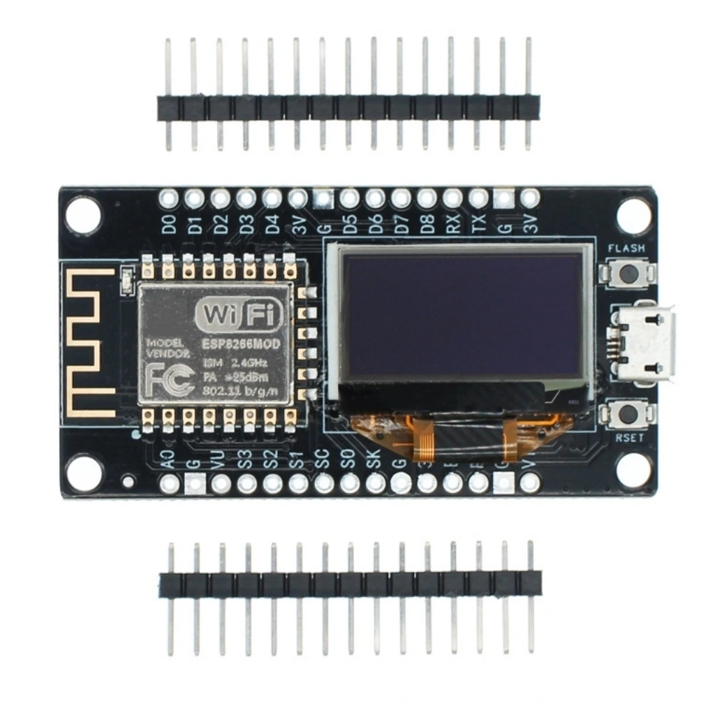 NodeMCU ESP8266 0.96 Inch OLED Wifi Geliştirme Modülü, IoT projeleriniz için ekran ve WiFi bağlantısını tek bir kartta sunan kompakt bir geliştirme platformudur. Entegre 0.96 inç OLED ekranı sayesinde sensör verilerini, sistem durumunu ve bilgileri anında görüntüleme imkanı sağlar.