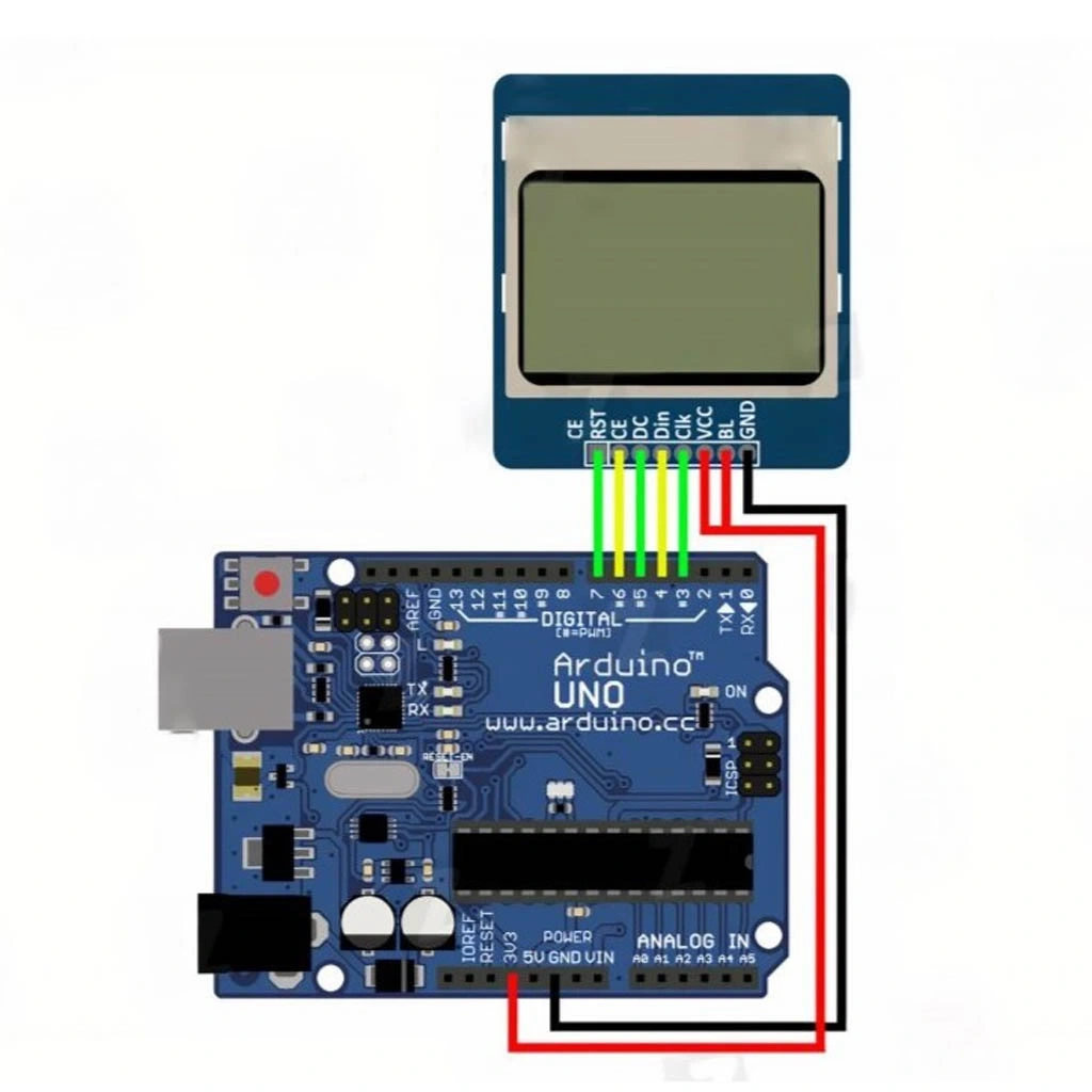 RST, CE, DC, DIN, CLK, VCC, BL ve GND pinleri Arduino'nun dijital pinlerine ve güç hatlarına bağlanır.