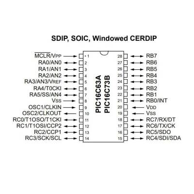 PIC16C63A/65B/73B/74B cihazları, PIC16CXX orta sınıf ailesindeki düşük maliyetli, yüksek performanslı, CMOS, tam statik, 8 bit mikrodenetleyicilerdir. PIC16C63A/73B cihazları 22 I/O pinine sahiptir. Cihaz 192 bayt RAM\\\'e sahiptir. Ayrıca, üç zamanlayıcı/sayıcı, iki Karşılaştırma/PWM modülü ve iki seri bağlantı noktası dahil olmak üzere çeşitli çevresel özellikler mevcuttur.
