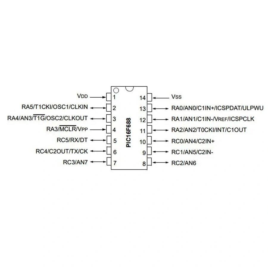 PIC16F688-I/P, Microchip firmasının sunduğu kompakt ve çok yönlü 8-bit mikrodenetleyicidir. PDIP-14 paketinde üretilen bu entegre, 20 MHz'e kadar çalışma frekansı ile verimli performans sunar.