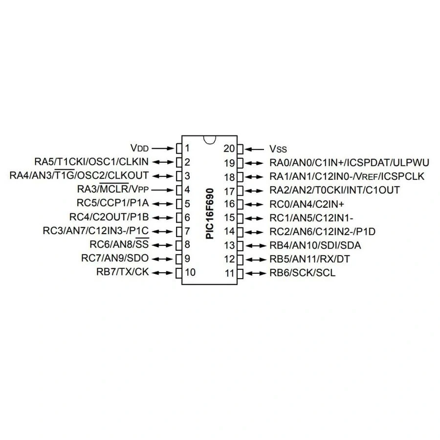 PIC16F690-I/P, Microchip firmasının çok yönlü 8-bit mikrodenetleyicisidir. PDIP-20 paketinde sunulan bu entegre, 20 MHz'e kadar çalışma frekansı ile çeşitli uygulamalar için ideal bir çözüm sunar.