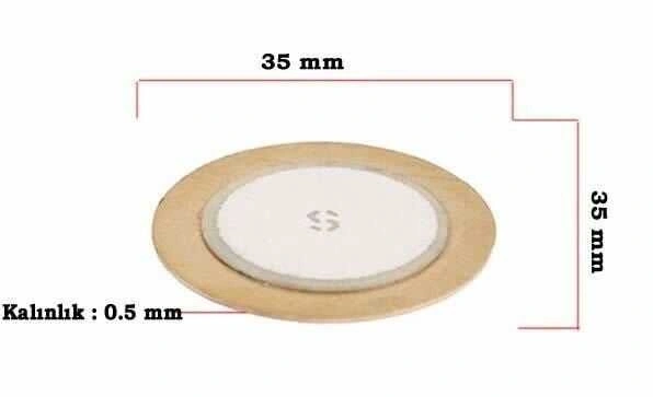35mm çaplı piezo disktir. Titreşim algılama, kontak mikrofonu vb. projelerinizde kullanabilirsiniz. Ayrıca Piezodiskler üzerilerine uygulanan basınçla düşük miktarlarda voltaj üretebilen, akıllı malzemeler sınıfında yer alan piezoelektrik ürünleridir..