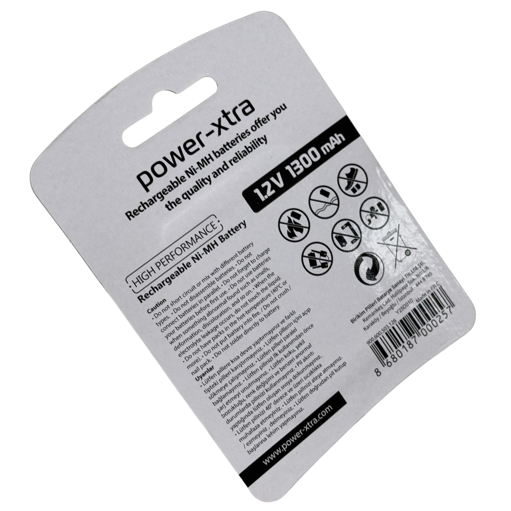 Power-Xtra 1.2V 1300 mAh AA (R6) şarjlı piller, günlük kullanımda tekrar tekrar şarj edilebilir yapısıyla hem çevre dostu hem de ekonomiktir. 2’li blister ambalajı sayesinde kolay taşınabilir ve depolanabilir. Düşük akım tüketen cihazlar için idealdir.
