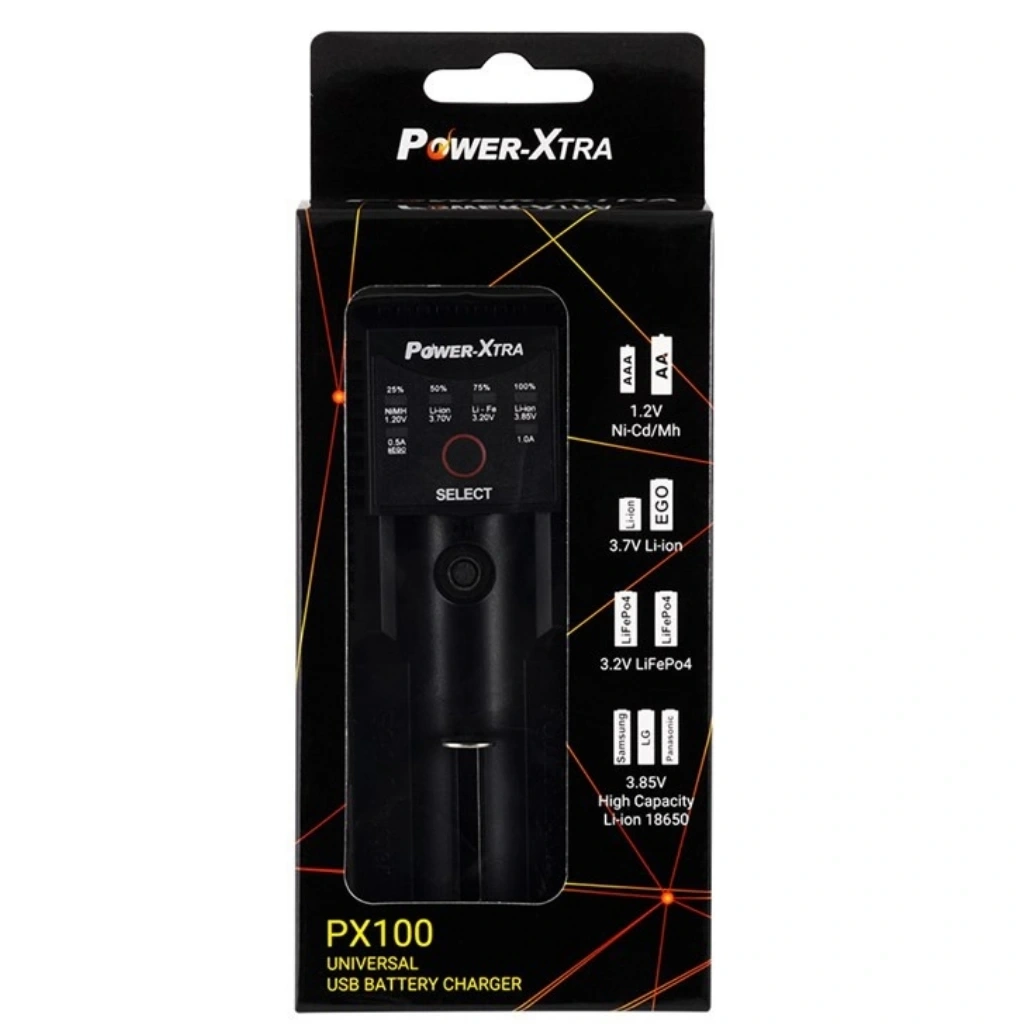 Power-Xtra PX100, 18650 tipi lityum iyon piller için özel olarak tasarlanmış, güvenli ve verimli bir şarj cihazıdır. Kompakt yapısı ve mikro USB girişi sayesinde kolay taşınabilirlik sunar. Aşırı şarj koruması, otomatik kesme ve LED durum göstergeleriyle donatılmıştır.