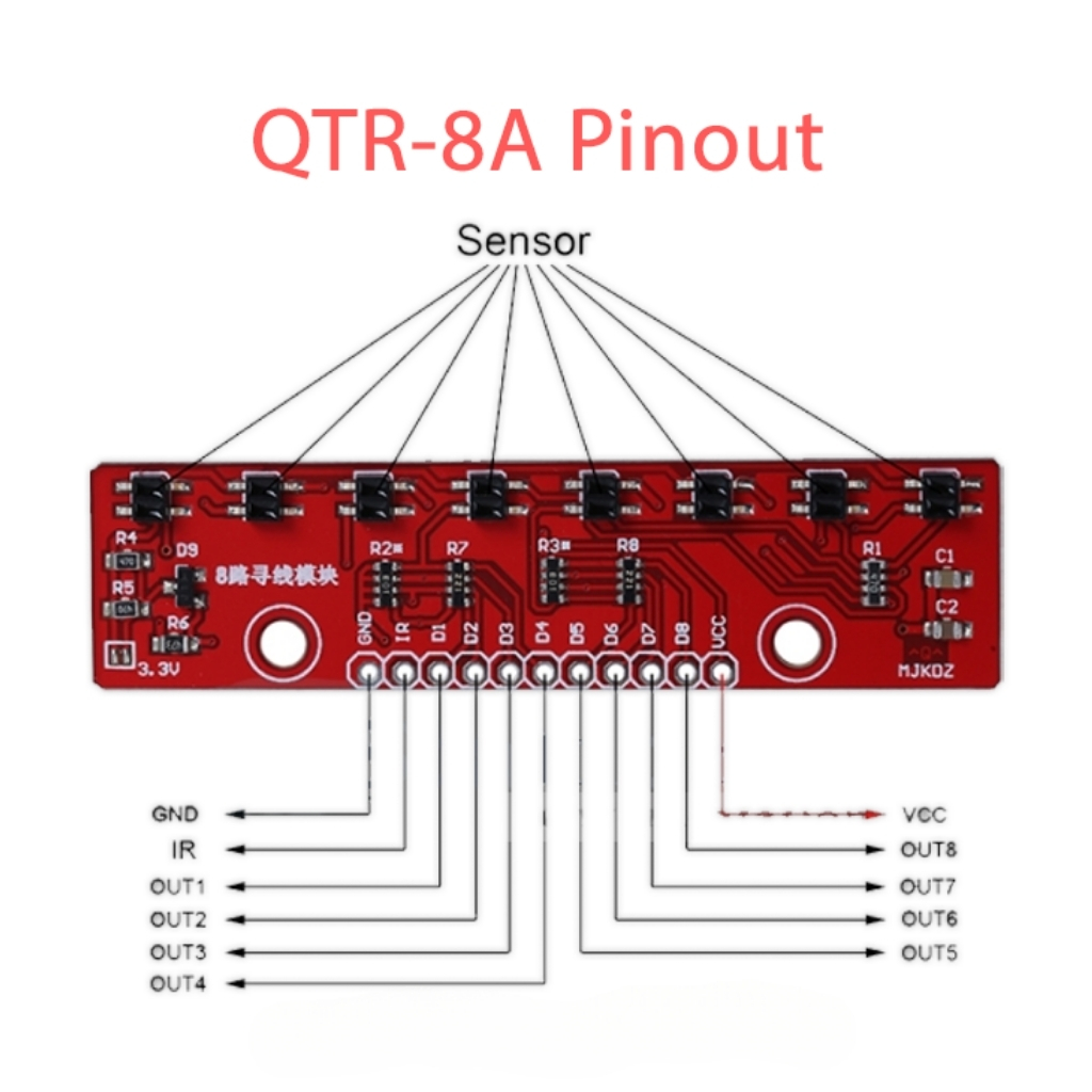QTR-8A, üzerinde 8 adet kızılötesi (IR) LED ve foto-transistör bulunan, yüzeydeki renk farklarını algılayabilen reflektans (yansıma) sensör modülüdür. Özellikle çizgi izleyen robot projelerinde zemin üzerindeki siyah-beyaz farkını algılamak için ideal bir çözümdür.QTR-8A aynı zamanda bir mesafe sensörü yada cisim algılama sensörü olarak ta kullanılabilir.